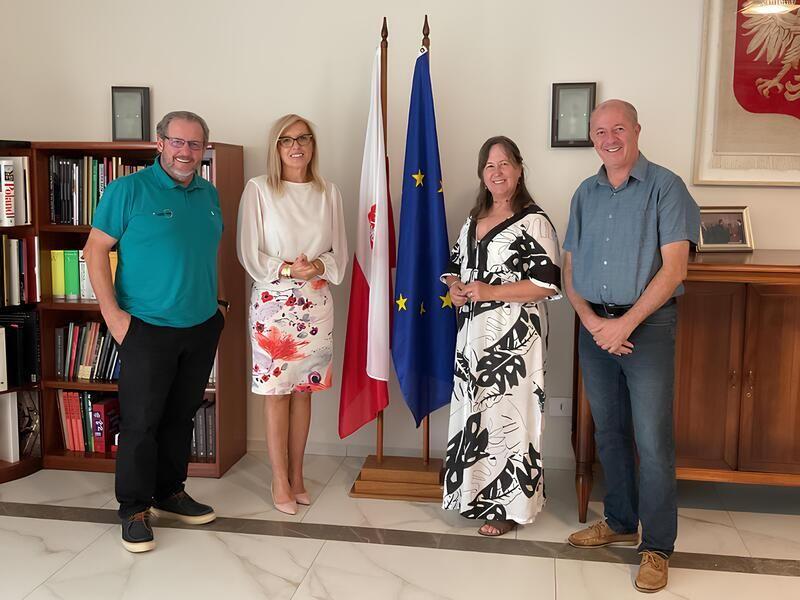A cônsul-geral da Polônia, em Curitiba, Marta Olkowska, recebeu em seu gabinete os coordenadores do projeto Plante e Colha Saúde, Euclides Lara Cardozo Junior e Jair Kotz, acompanhados da superintendente do MDA, Leila Klenk